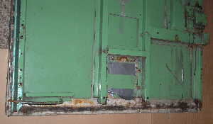 The door should be layed on a surface that protects the door skin from scratches. The door skin is carefully turned back along the edge where the replacement is to be made - in this case, the whole of the bottom edge. The rusted section is then cut out with an angle grinder, ensuring that clean straight edges are left to weld onto. Photo shows the bottom rail cut out.
