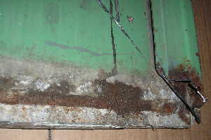 The door skin is aluminium alloy and does not rust. However, where it has been in contact with the steel door frame there can be electrolytic corrosion whenever the two dissimilar metals are directly in contact in the presence of water. This is one reason why the back of the frame insert should be painted prior to welding it into position. The inside of the door skin should be similarly painted for the benefit of yourself and/or the next owner. Just don't paint edges that are to be welded.